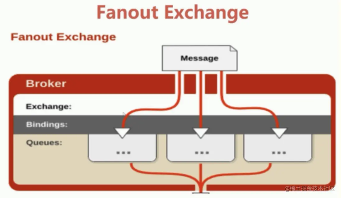广播交换机,不处理路由,只需要将队列绑定到交换机上,发送到交换机的消息会被转发到与该交换机绑定的所有的队列上。