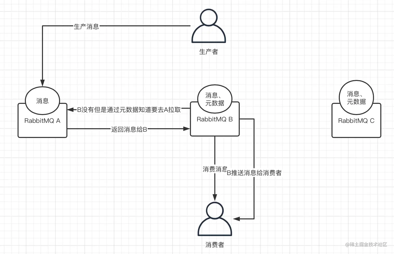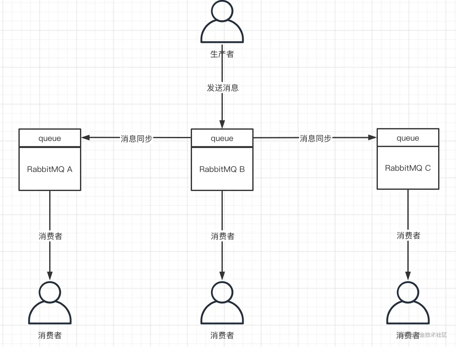 多台机器上启动多个RabbitMQ实例,以两个节点(node-1,node-2)为例来进行说明。对于queue来说,消息实体只存在于其中一个节点node-1或者node-2,node-1和node-2两个节点仅有相同的元数据(即队列相关的结构)。当消息进入node-1后,consumer从node-2节点消费时,RabbitMQ会临时在node-1、node-2间进行消息传输,把A中的消息取出来并经过B在发送给consumer,所以consumer以ing改尽量连接每一个节点,从中获取消息。负责无论consumer连接node-1或者node-2,出口总在node-1,会产生瓶颈,如果当node-1节点故障后,node-2无法获取node-1的消息。如果做了持久化,那么必须要等到node-1恢复后,才能继续消费,如果消息没有做持久化,就会出小消息丢失的情况。