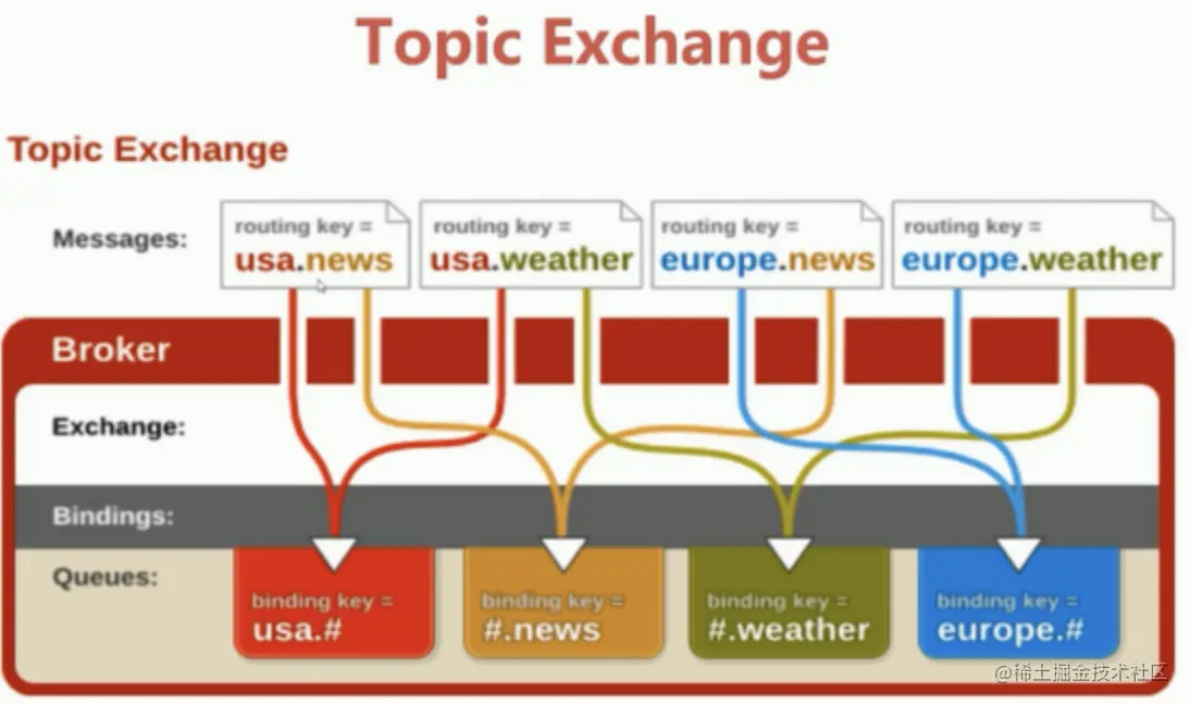 - exchange:message到达broker的第一站,根据分发规则,匹配routing key,将消息分发到queue中去。常用的类型有direct(点对点)、topic(规则匹配)、fanout(广播)