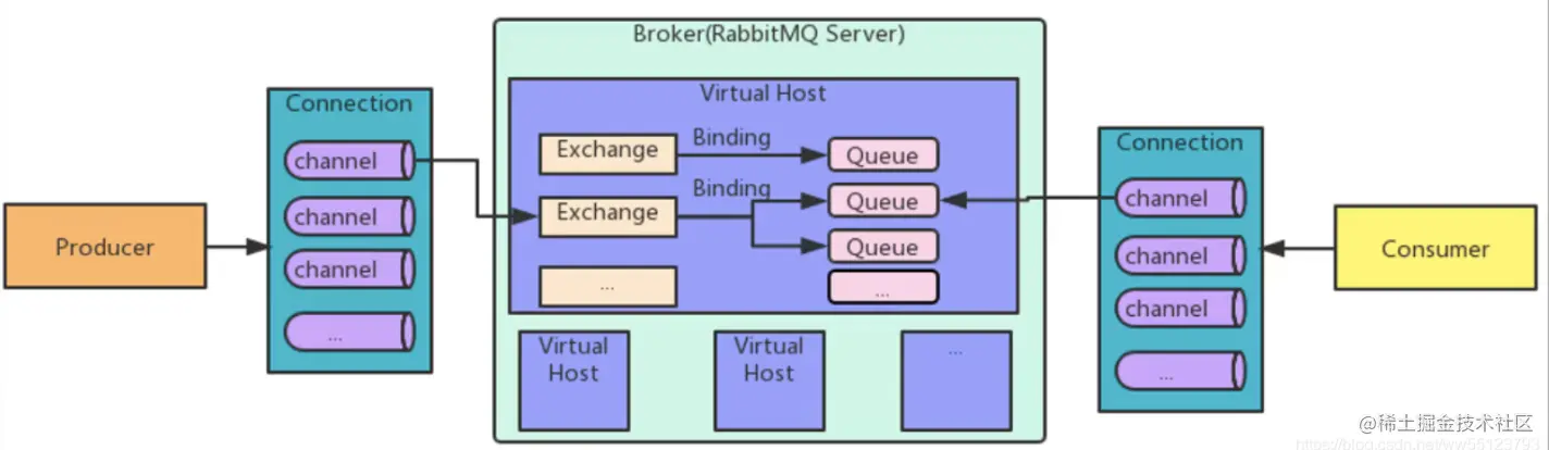 - virtual host:出于多租户和安全因素,把AMQP的基本组件划分到一个虚拟的分组中,类似于网络中的namespace概念。当多个不同的用户使用同一个RabbitMQ server提供的服务时,可以划分出多个vhost,每个用户在自己的vhost中创建exchange、queue等。