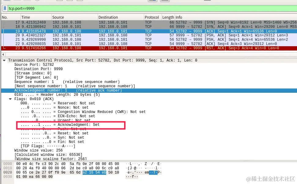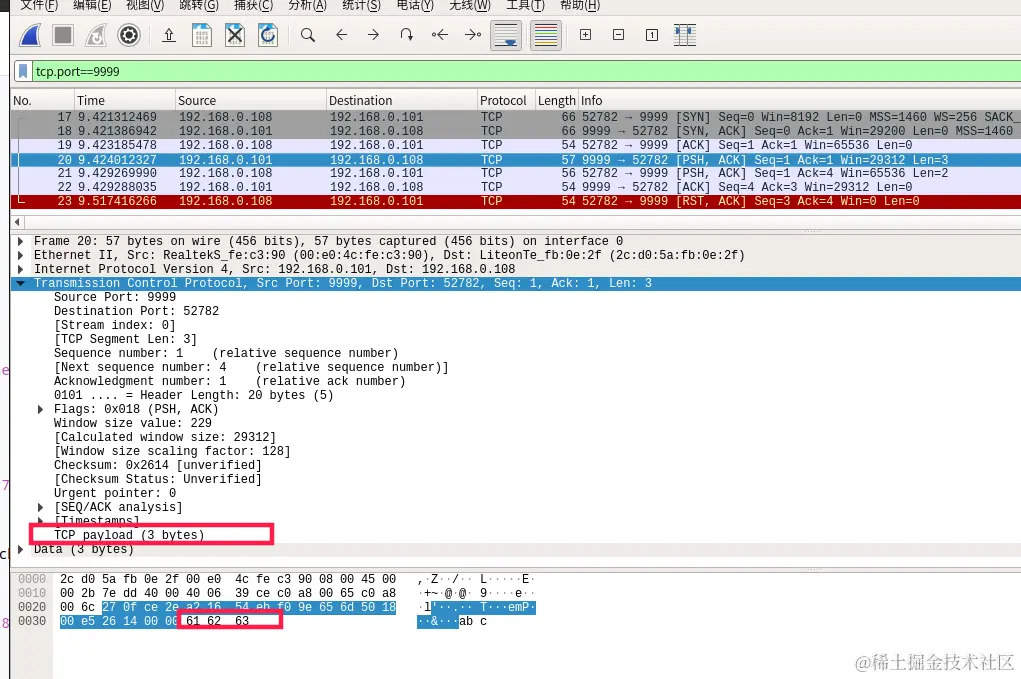 然后服务端会主动发送字符"abc"客户端,所以第四次的数据包是由192.168.0.101发送给192.168.0.108,这个数据包最后3个字节就是发送的数据,为"abc"。