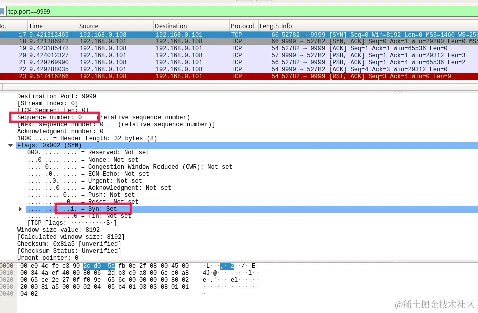 第一次握手包如下,SYN为1,ACK为0,seq为0。