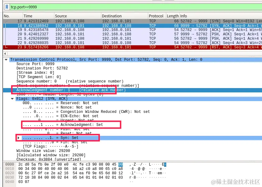 第二次握手是服务器返回给客户端的,192.168.0.101发送给192.168.0.108,ACK和SYN都为1,ack应该x+1,这里的x是第一次握手时候的序号,所以这里最后是1。
