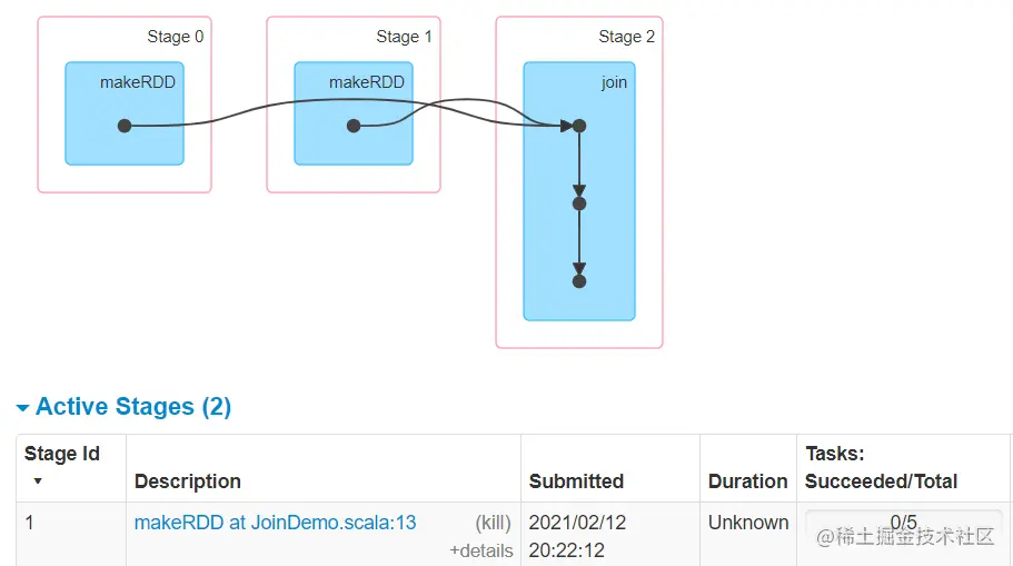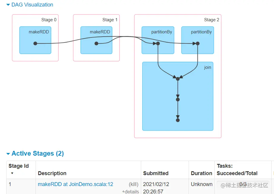 关于stage划分和宽依赖窄依赖的关系,从2.1.3 如何区别宽依赖和窄依赖就知道stage与宽依赖对应,所以从rdd3和rdd4的stage的依赖图就可以区别宽依赖,可以看到join划分除了新的stage,所以rdd3的生成事宽依赖,另外rdd1.partitionBy(new HashPartitioner(3)).join(rdd2.partitionBy(new HashPartitioner(3))) 是另外的依赖图,所以可以看到partitionBy以后再没有划分新的 stage,所以是窄依赖。