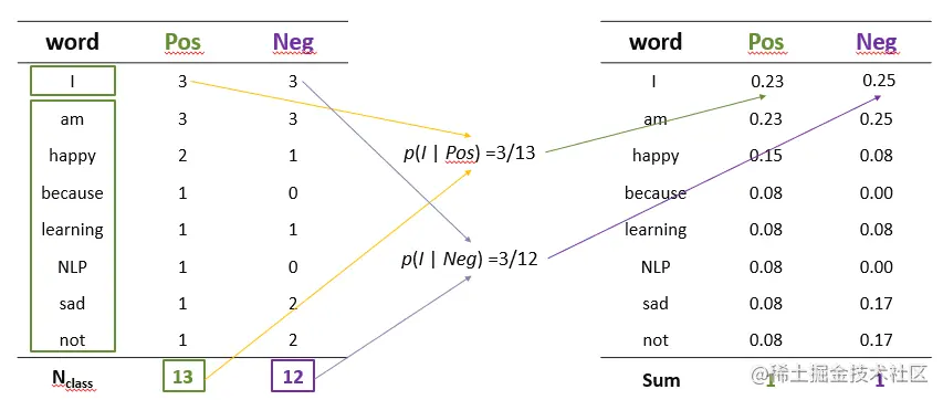 如下所示计算在 pos, neg 类别下单词出现的概率: