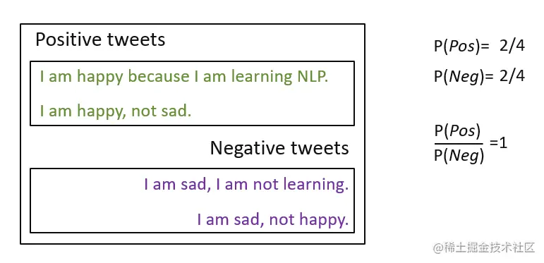 假设我们有2条pos(正向)语料,2条neg(负向)语料,下面我们基于这些语料计算 pos, neg 的概率以及在这些类别下各个单词出现的概率。