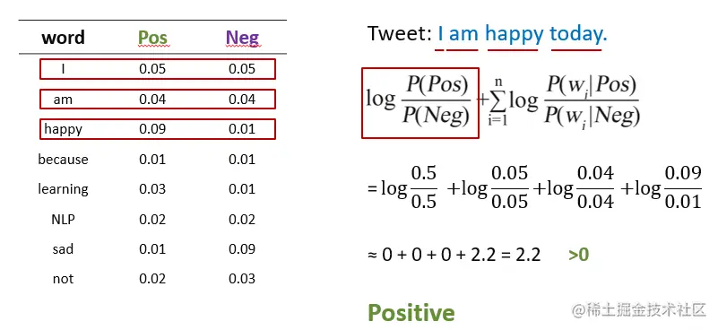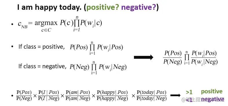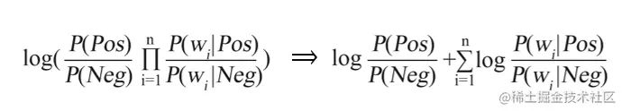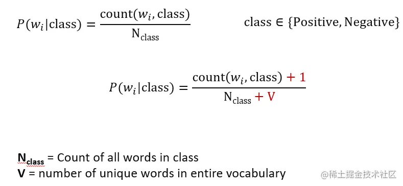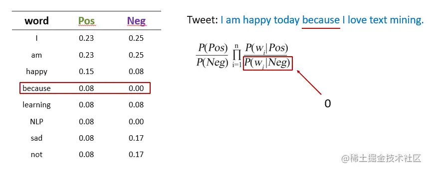 平滑处理:如图所示单词 because 在 neg 类别下的概率为0, 为了避免 zero division error, 我们需要做拉普拉斯平滑处理,即假设每个单词在每个类别下都至少出现了1次。