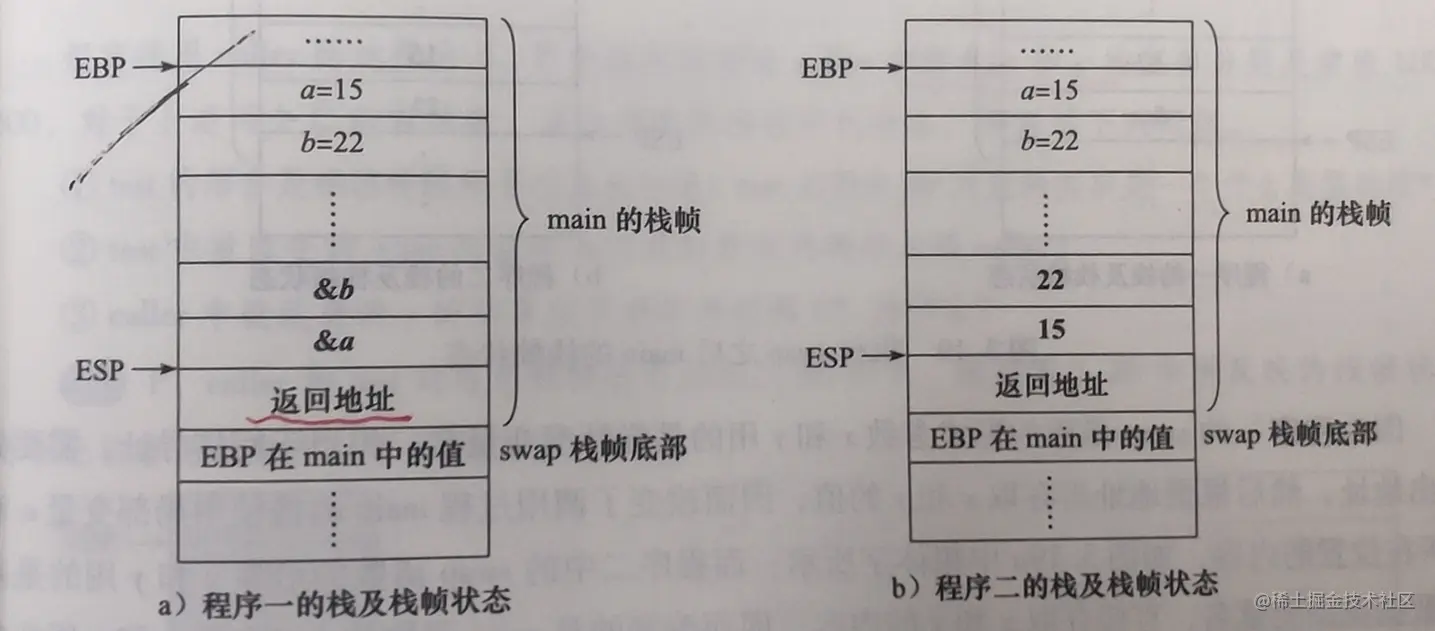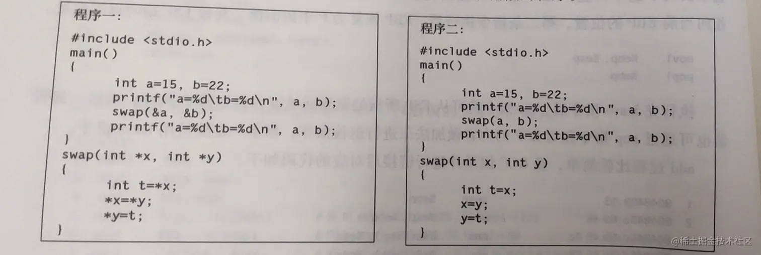 因为程序一的 swap 函数的形式参数 x 和 y 用的是指针型变量名,相当于间接寻址,需要先取出地址,然后根据地址再存取 x 和 y 的值,因而改变了调用过程 main 的栈帧中局部变量 a 和 b 所在位置的内容;而程序二中的 swap 函数的形参 x 和 y 用的是基本数据类型变量名,直接存取 x 和 y 的内容,因而改变的是 swap 函数的入口参数 x 和 y 所在位置的值。
