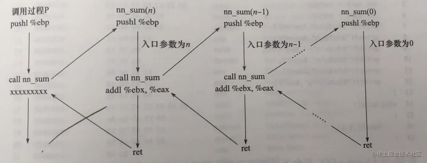 过程调用中使用的栈机制和寄存器使用约定,使得可以进行过程的嵌套调用和递归调用。