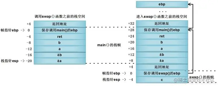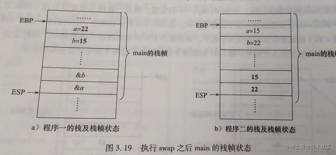 至此,我们分析了程序一和程序二之间明显的差别。程序已中调用 swap 后回到 main 执行时,a 和 b 的值已经交换过了,而在程序二的执行过程中,swap 过程实际上交换的是其两个入口参数所在位置上的内容,并没有真正交换 a 和 b 的值。