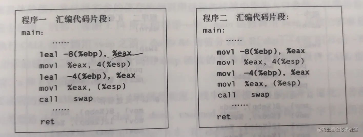 区别:程序一用 leal 指令,程序二用 movl 指令。