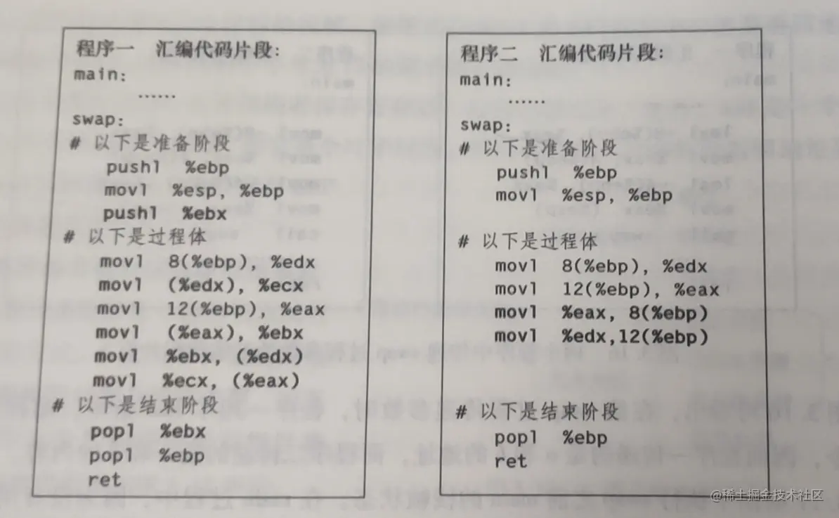程序一的 swap 过程体比程序二的 swap 过程体多了三条指令,而且使用了较多的寄存器。(由于使用了被调用者保存寄存器 EBX,他的值必须在准备阶段被保存到栈中,而在结束阶段从栈中恢复,因而他比程序二又多了一条 push 指令和一条 pop 指令。