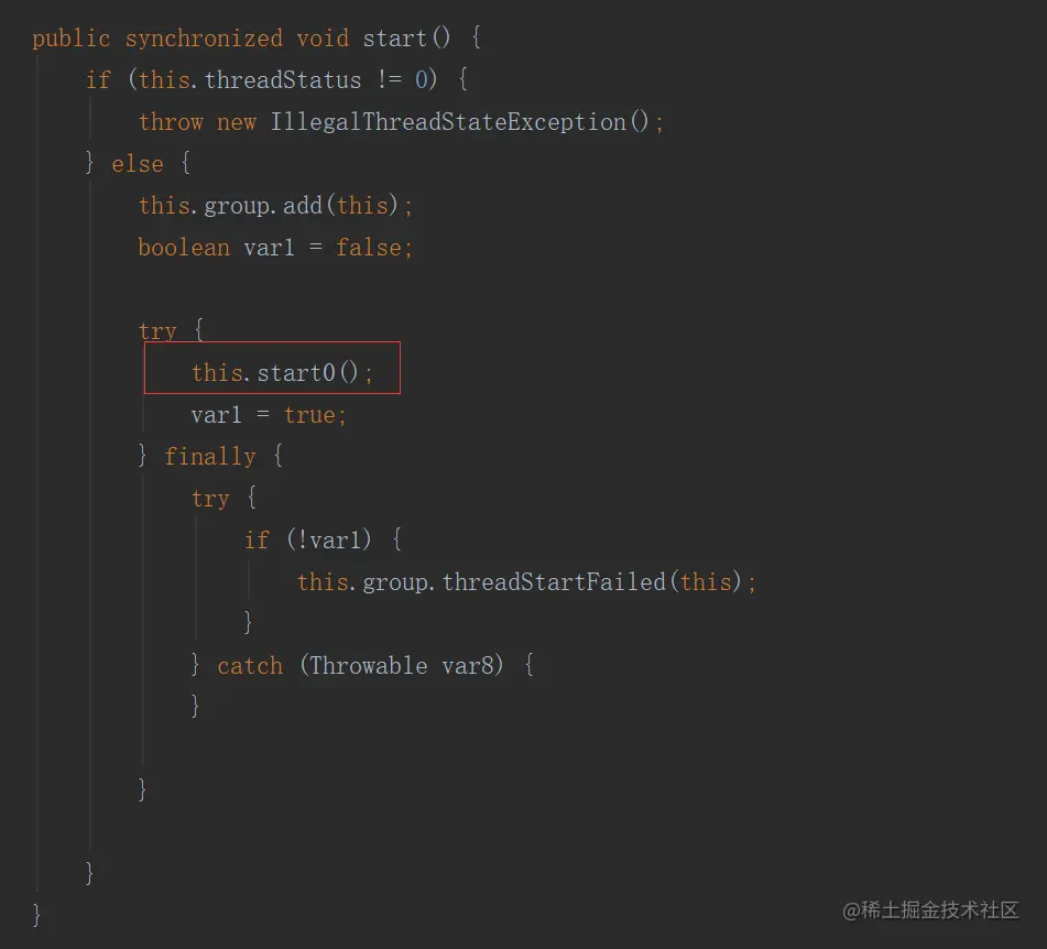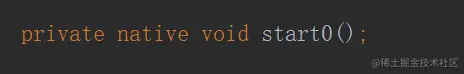 start方法就不一样了。我们可以看到关键的代码就是start0方法。var1理解为线程为启动,调用start0后,线程启动。继续追踪start0.