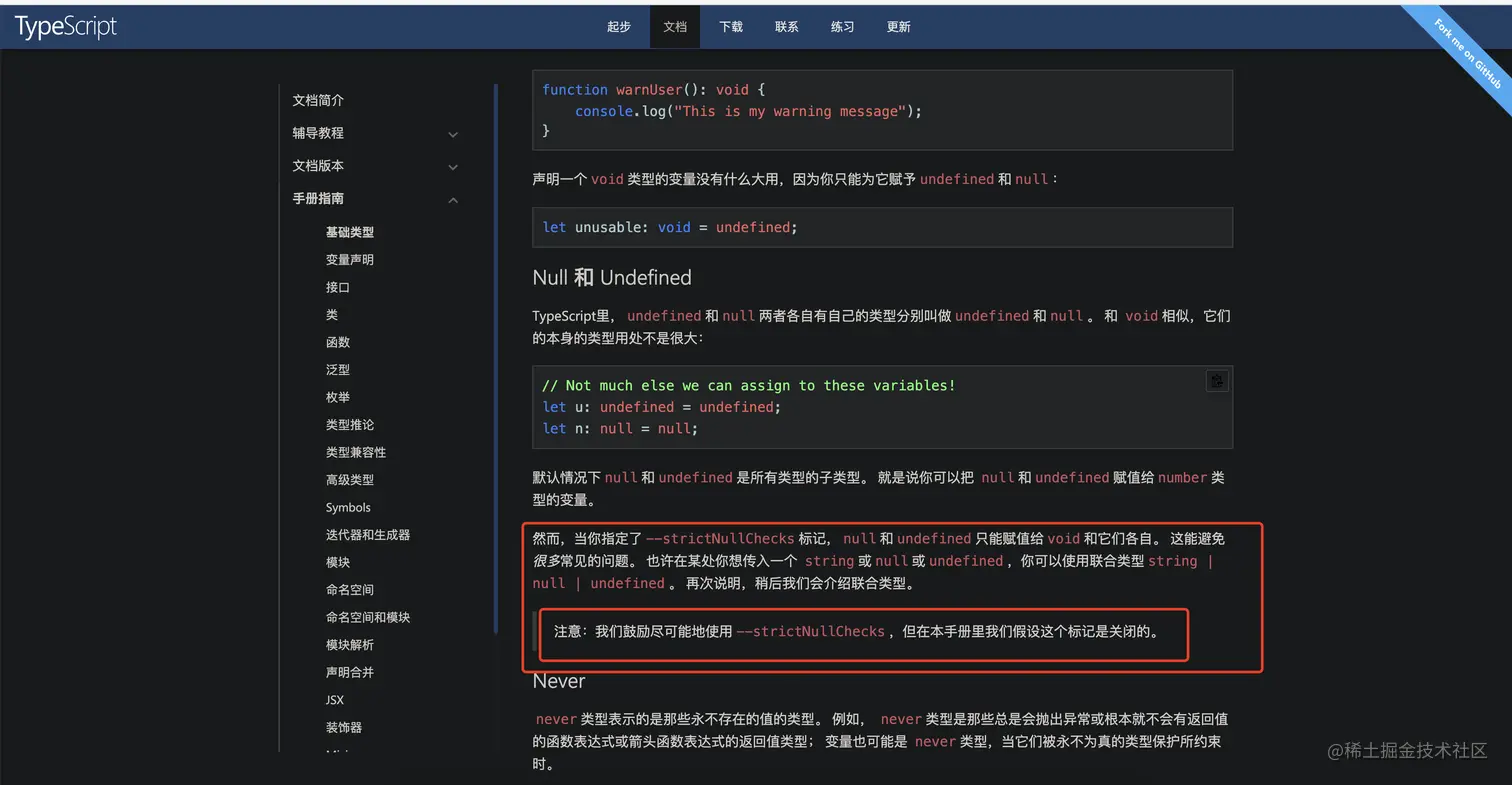实际上文档下面标注了,strictNullChecks这个选项在文档介绍中是关闭的