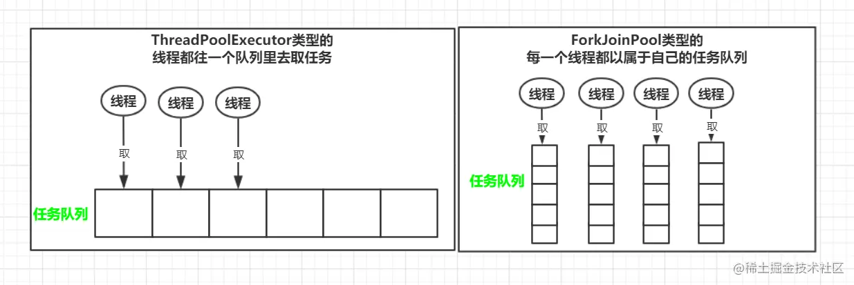 ForkJoinPool是每个线程都有属于自己的任务队列,每次都去自己的任务队列中取任务,当有的线程把自己队列的任务执行完之后,会去别的任务队列的屁股上去”偷“任务,不讲码德,马保国直呼内行