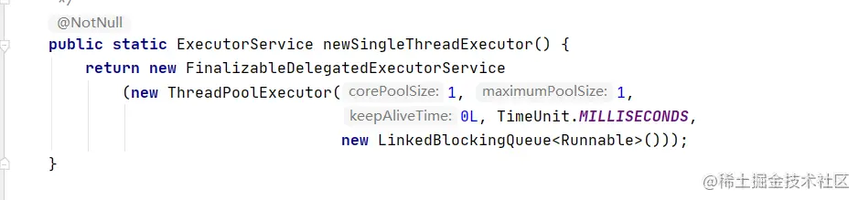 来,在看这个好玩的,乍一看,我敲!一个核心线程,最大线程也是一,那不就是永远只有一个线程嘛,存活时间0,用的LinkedBlockingQueue作为队列,一个一个排好队来执行