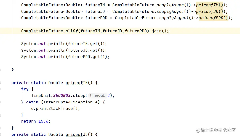 兄弟萌,请看,我写了3个方法,priceofTM、priceofJD、priceofPDD,都是睡不同秒钟,然后让3个CompletableFuture去执行,然后交给一个CompletableFuture去管理,调用这个allOf方法阻塞,直到所有方法执行完毕,它还有一个anyOf是当有一个执行完毕就解除阻塞