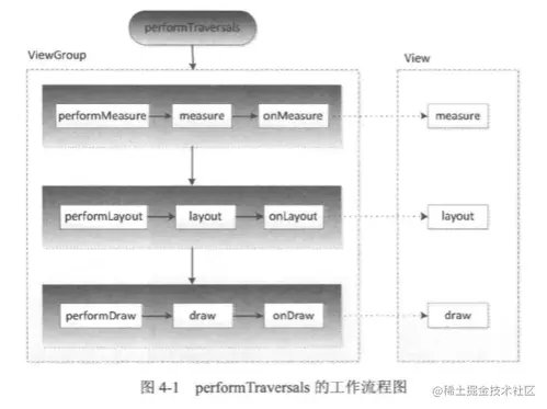 View的绘制流程是从ViewRoot的performTraversals 方法开始的,它经过measure. layout和draw三个过程才能最终将一个 View绘制出来,其中measure用来测量View的宽 和高,layout用来确定View在父容器中的放置位置,而draw则负责将View绘制在屏幕上。 针对performTraversals的大致流程,可用流程图4-1来表示。