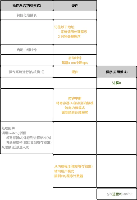 因此,在协作调度系统中,OS通过等待系统调用,或某种非法操作发生,从而重新获得CPU的控制权。