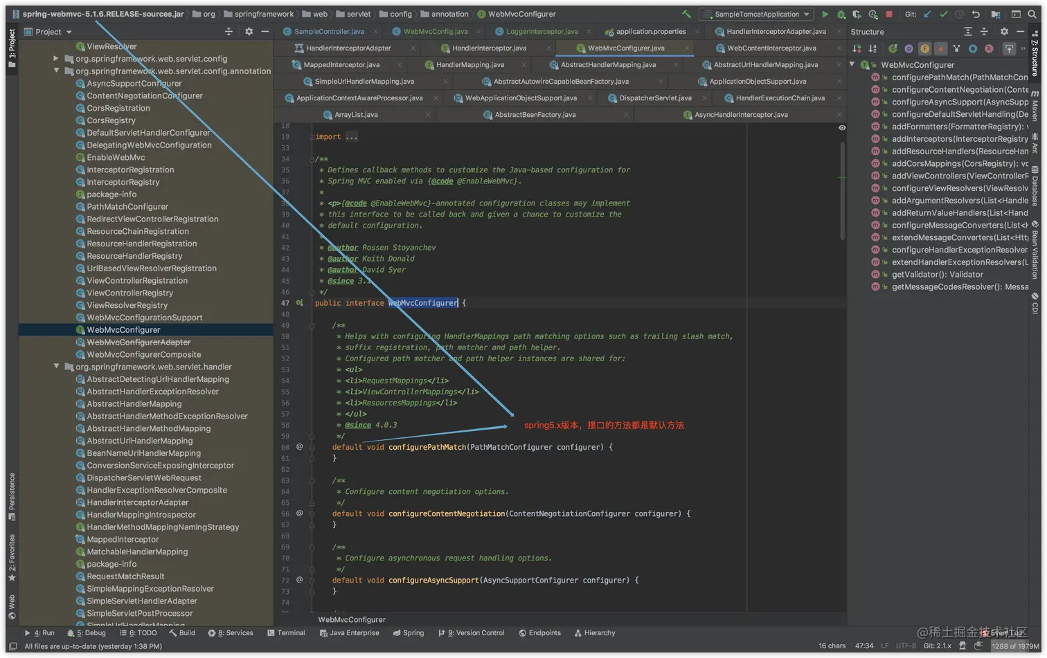 springboot里的配置类都要实现的接口WebMvcConfigurer,里面的方法全部都是默认方法,我们实现的时候只需要挑自己想实现的就可以。