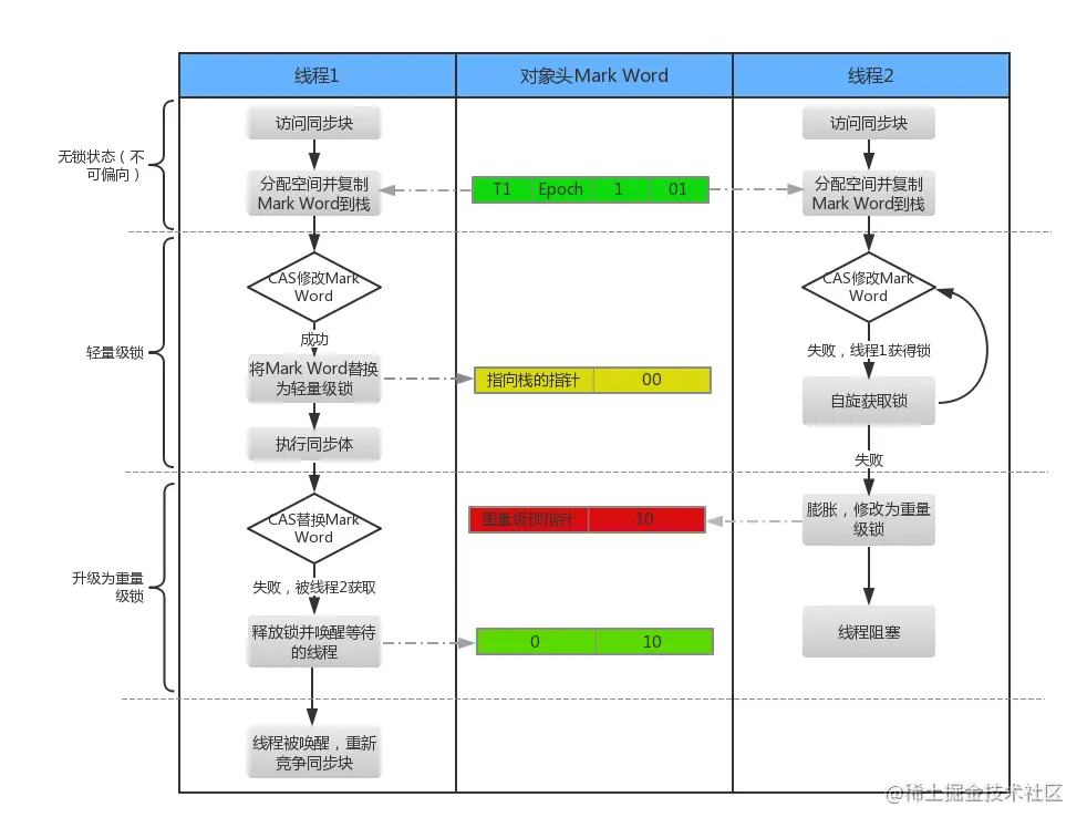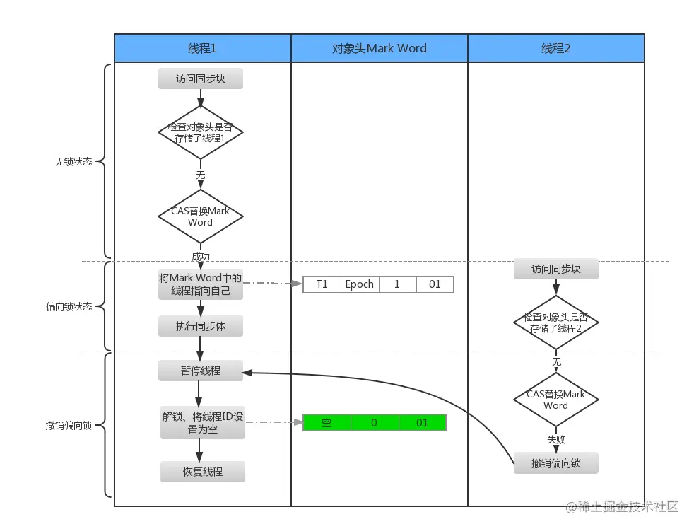 当一个线程访问同步块并获取锁时,会在对象头和栈帧中的锁记录里存储锁偏向的线程 ID,以后该线程在进入和退出同步块时不需要进行 CAS 操作来加锁和解锁,只需测试一下对象头的 Mark Word 是否存储着指向当前线程的偏向锁。如果测试成功,表示线程已经获得锁,否则再测试一下 Mark Work 中偏向锁的标识是否设置成 1(表示当前是偏向锁),如果没有设置,使用 CAS 竞争锁,否则尝试使用 CAS 将对象头的偏向锁指向当前线程