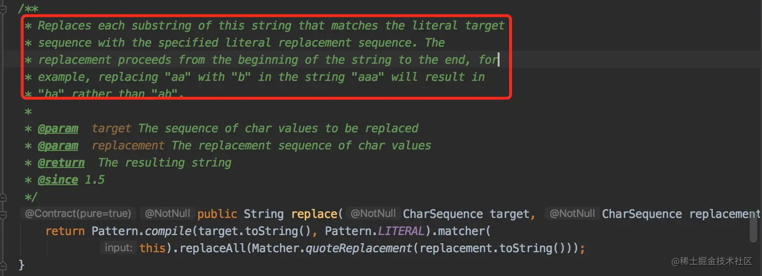 另一个方法的参数是:CharSequence target 和 CharSequence replacement,支持字符串的替换。