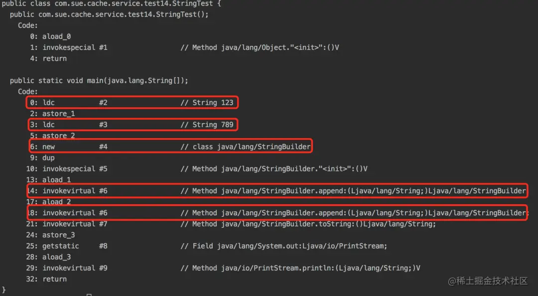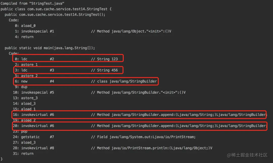 使用javap -c StringTest命令反编译: