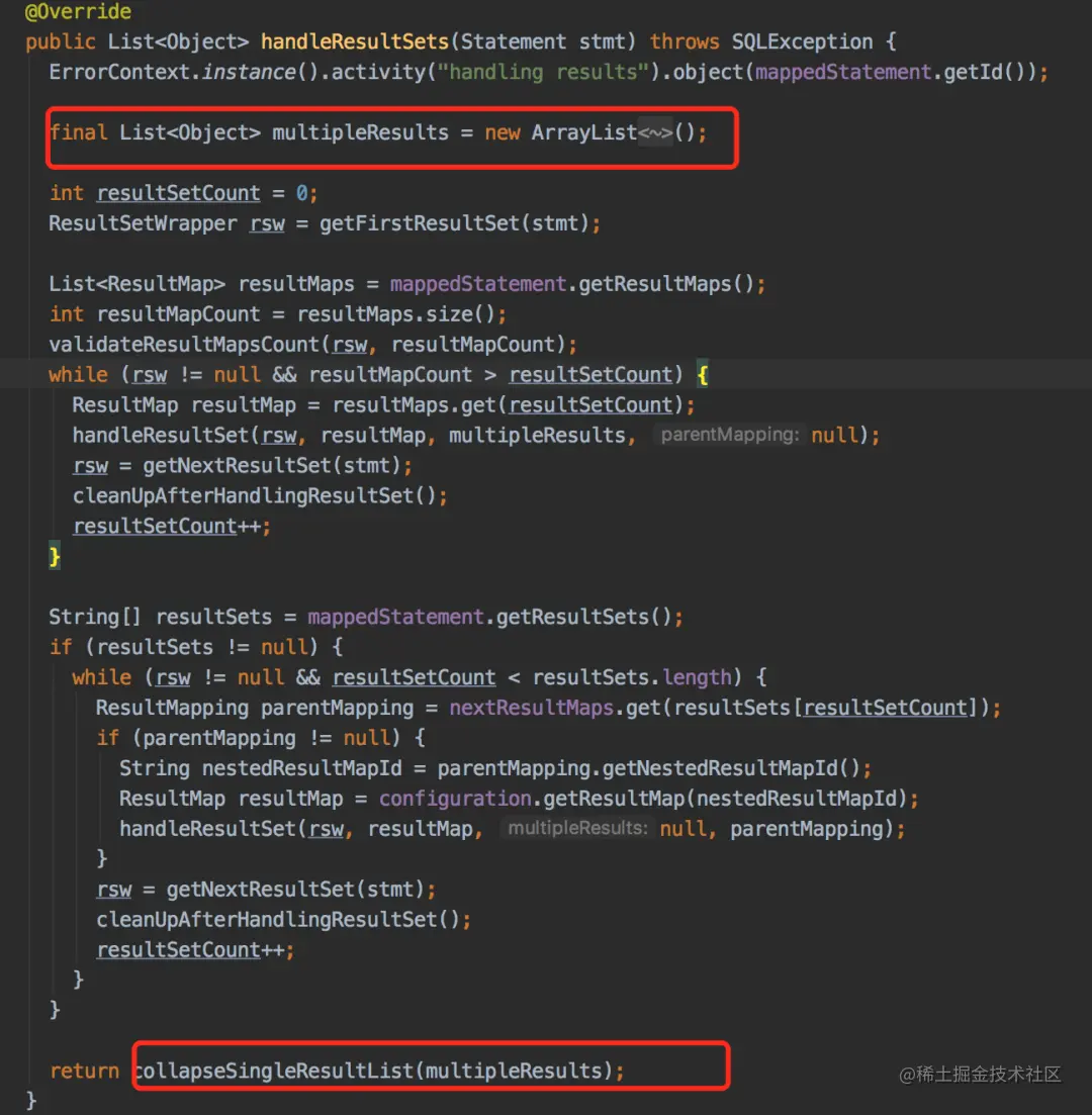 mybatis的查询方法最终都会调到DefaultResultSetHandler类的handleResultSets方法: