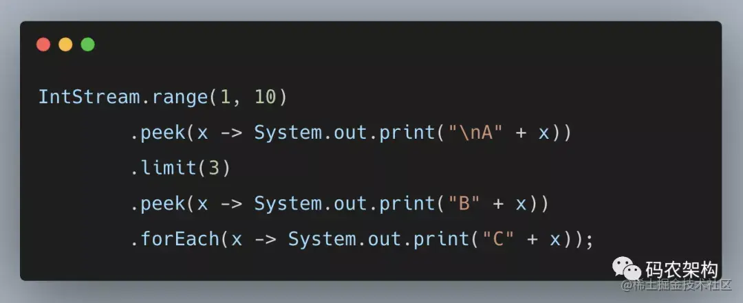 ... 当第四次forEach执行的时候,然后会回溯peek 操作,然后peek会回溯更上一步的limit操作,到limit的时候,发现limit(3)这个job已经完成,这里就相当于循环里面的break操作,跳出来终止循环。