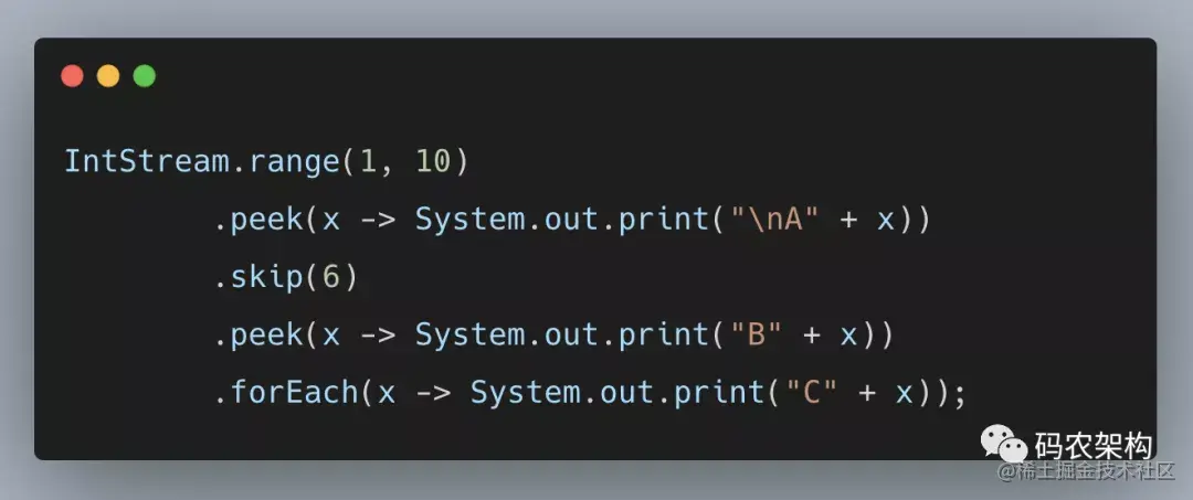 输出为:A1 A2 A3 A4 A5 A6 A7B7C7 A8B8C8 A9B9C9 第一次forEach执行的时候,会回溯peek操作,然后peek会回溯更上一步的skip操作,skip回溯到上一步的peek操作,顶层没有操作了,开始自上向下开始执行,执行到skip的时候,因为执行到skip,这个操作的意思就是跳过,下面的都不要执行了,也就是就相当于循环里面的continue,结束本次循环。输出:A1