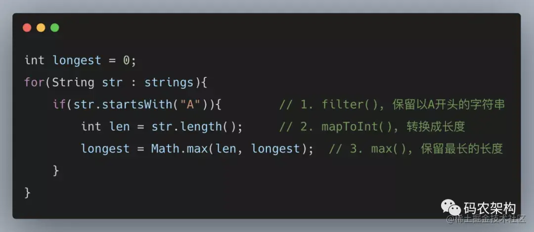 这些弊端使得效率底下,根本无法接受。如果不使用Stream API我们都知道上述代码该如何在一次迭代中完成,大致是如下形式: