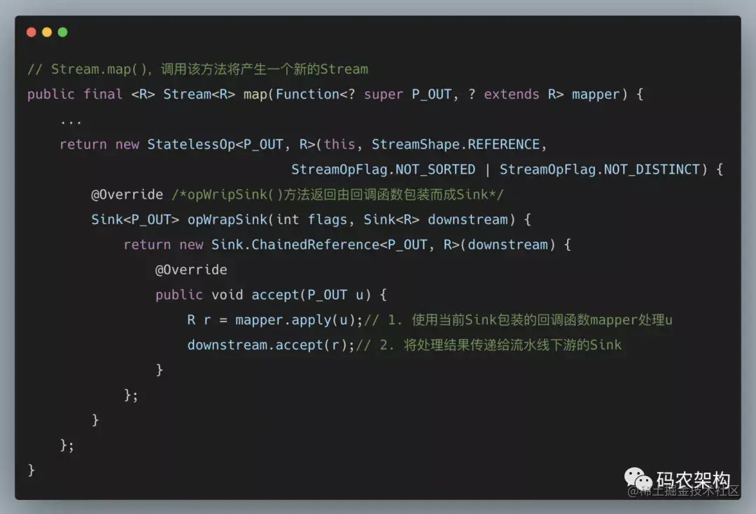 上述代码看似复杂,其实逻辑很简单,就是将回调函数_mapper_包装到一个Sink当中。由于Stream.map()是一个无状态的中间操作,所以map()方法返回了一个StatelessOp内部类对象(一个新的Stream),调用这个新Stream的opWripSink()方法将得到一个包装了当前回调函数的Sink。