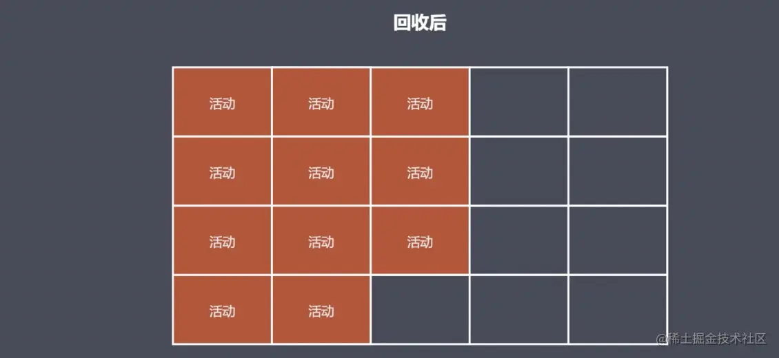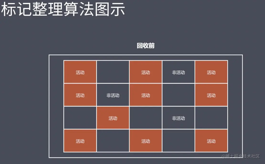 - 标记清除:可以在 GC 工作的时候去给到那些活动对象添加上一个标记,来判断它是否是一个垃圾;