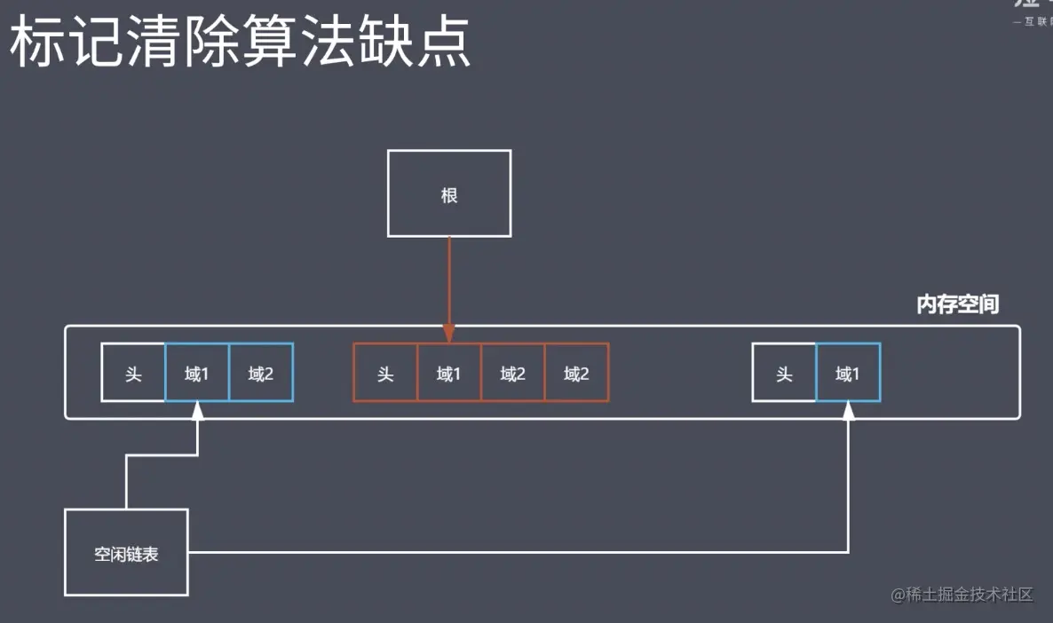 第二个阶段,仍然回去遍历所有的对象然后把那些身上没有标记的对象进行清除。同时需要注意的就是在第二阶段当中它也会把第一个阶段所设置的标记给抹掉,便于 GC 下次还能够去正常的工作,这样一来的话它就可以去通过两次的遍历行为,把当前这样一个垃圾空间去进行回收最终在交给相应的空闲列表进行维护。