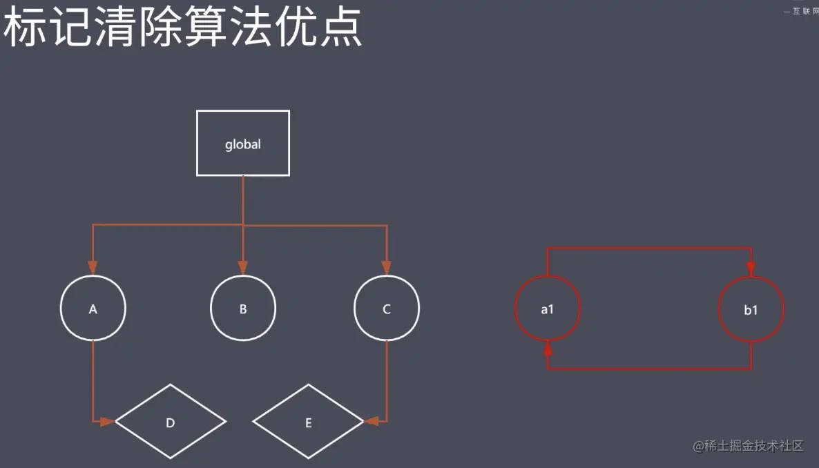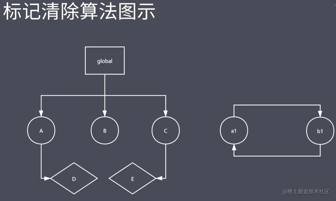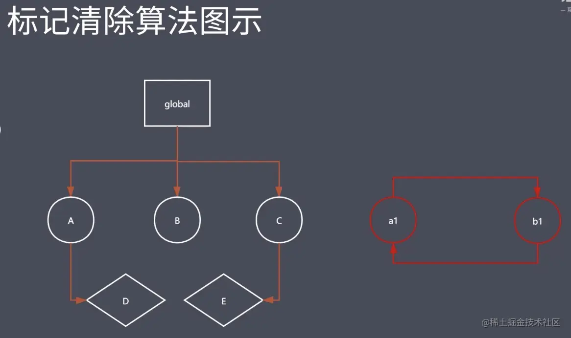 这就是标记清除算法的实现原理,其实就是两个操作:第一就是标记、第二就是做清除。为了方便理解下面用图示做举例说明:在全局的地方我们可以找到 A、B、C 这样的三个可达对象。找到这三个可达对象之后,会发现它的下边还会有一些子引用,所以这就是标记清除算法强大的地方。如果我们发现它的下面会有还在甚至于说孩子的孩子,这个时候它会去用递归的方式继续寻找那些可达的对象,如图中的 D、E 也会被做可达的标记。那么这个时候图中的 a1、b1 放在右侧它可能是由于我们当前放在了一个局部作用域,而当前这个作用域执行完成以后这样一个空间就被回收了。所以从当前 global 这样一个链条下我们是找不到 a1、b1 的。这个时候 GC 机制就会认为它是一个垃圾对象,没有去给他做标记,最终呢在我们 GC 去工作的时候就会找到 a1、b1 然后直接把它们回收掉。这就是标记清除的标记阶段和清除阶段要做的事情,简单的整理一下就是分成两个步骤:在第一个阶段当中我们要去找到所有可达对象,如果说在这里涉及到了我们这样应用的一个层次关系,那么它回去递归的进行查找。就想图中的 global 找 A 再找 D 这样一个过程。找完以后它会将这些可达对象都进行标记,标记完成以后会进行第二个阶段。然后会开始做清除,找到那些没有去做标记的对象。同时呢还会将之前第一次所做的标记也给它清除掉,这样我们就完成了一次垃圾的回收。同时呢我们还要好留意最终它还会去把回收的空间直接放在当前的和一个叫做空闲列表上面,方便我们后面的程序可以直接在这去申请空间使用。