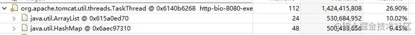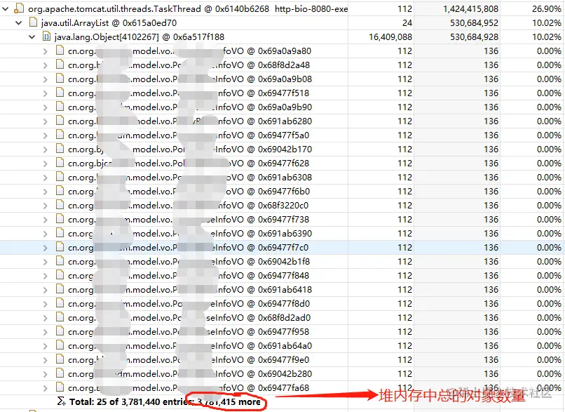 可以看到一个ArrayList对象,这个对象占用了10.02%的空间,这个占用很大,继续看这个ArrayList持有了什么对象。