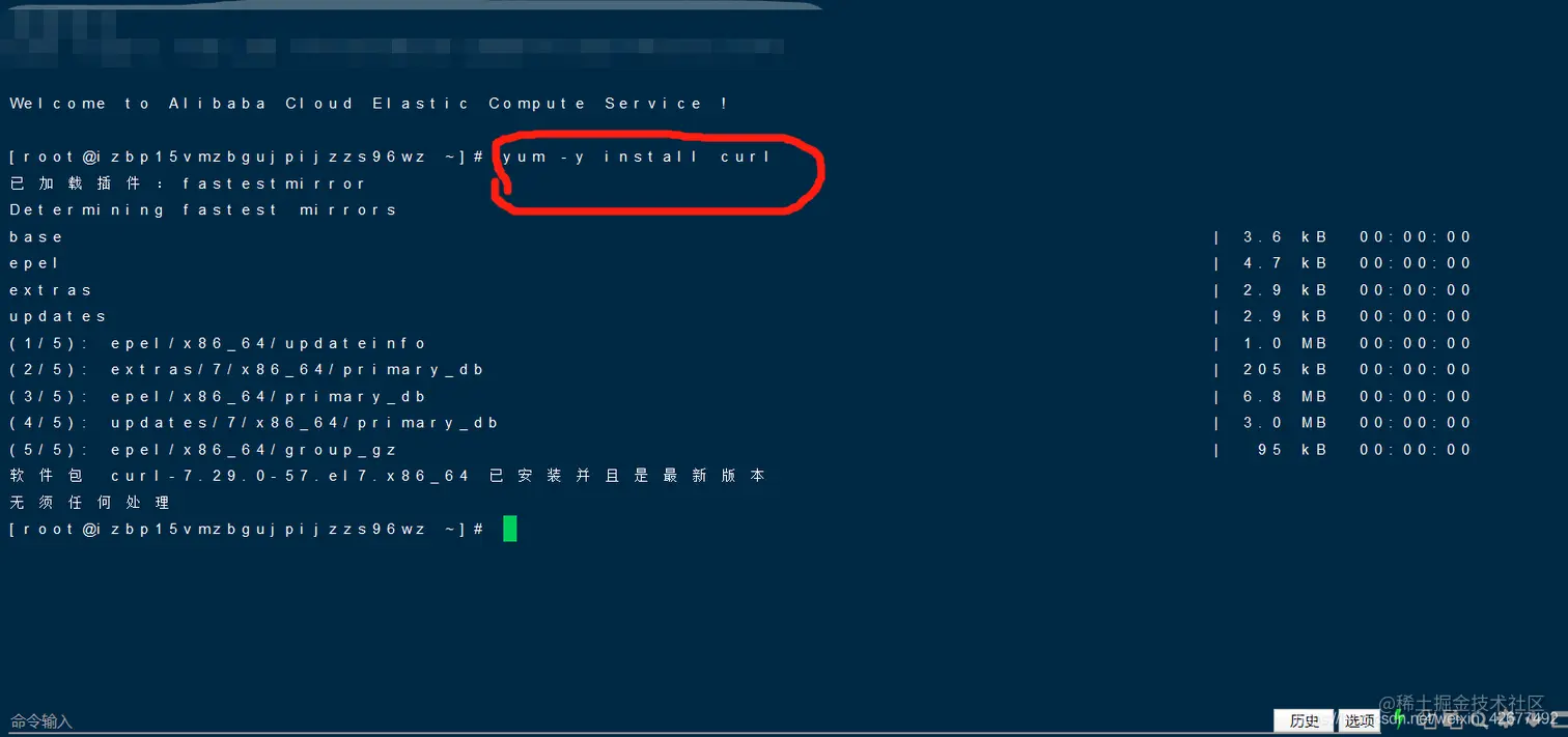- 使用SSH连接服务器 输入代码 开启curl