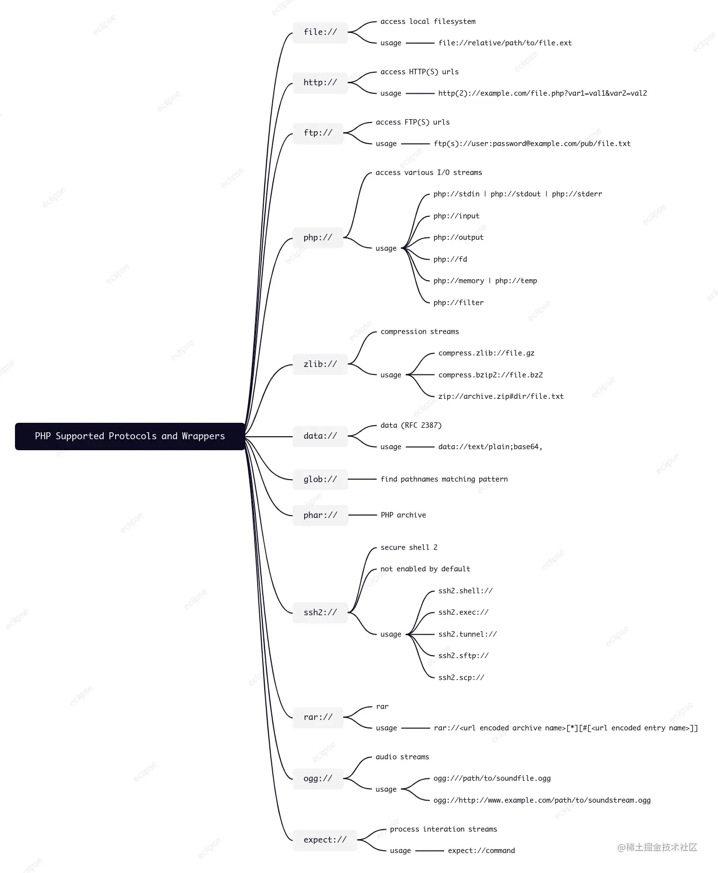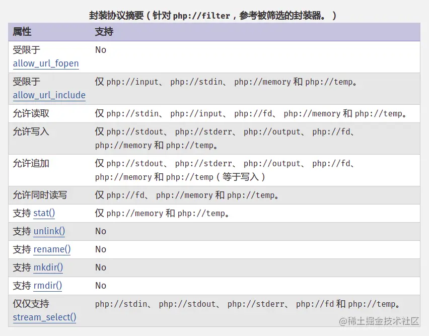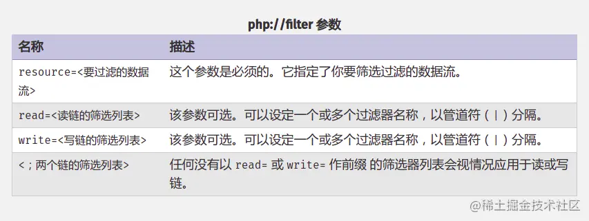 php://filter 用于数据流打开时的筛选过滤;应用于 all-in-one (一体式) 文件系统函数 (比如:readfile(), file(), file_get_contents()),在数据流读取之前没有机会应用其他过滤器;复合过滤链能在一个路径上制定: