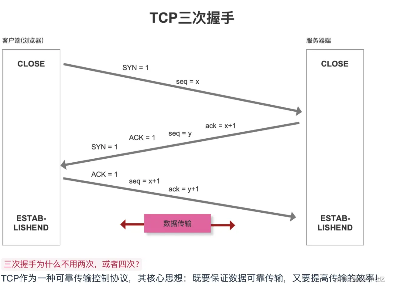 TCP三次握手 gggg434343_321 2021-02-15 221 阅读1分钟 标识符: (1)SYN:发起一个新连接 (2)ACK:确认序号有效 序列号和确认号: (1)seq序号:用来标识从TCP源端向目的端发送的字节流, 发起方发送数据时对此进行标记(表示当前TCP数据报数据的第一个字节的序号是多少) (2)ack确认序号:只有ACK标志位为1时,确认序号字段才有效, ack=seq+1;表示数据接收端期望收到的下一个数据的序号是多少, 同时也表示上一个序号之前的数据已收到