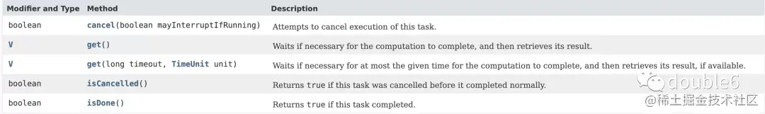 正如注释所说:Future表示异步执行的结果。Future提供的这些方法用于检测任务是否完成、等待任务完成、获取计算结果。通过get方法可以获得结果,但是有可能会等待任务计算完成。cancel方法可以取消任务(但是任务一旦完成,就不能被取消了)。如果不想要返回值,但是却想cancel任务,可以通过Future<?>并返回null的方式实现。