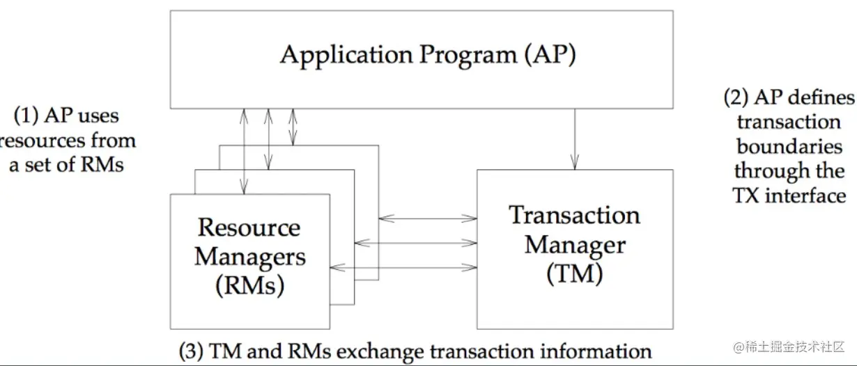 - 资源管理器(Resource Manager,简称RM):如数据库、文件系统等,并提供访问资源的方式