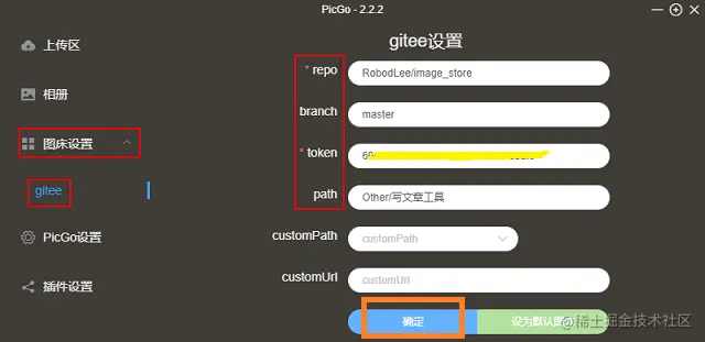 插件安装完成后,依次点击图床设置——>gitee,然后右侧会出现需要填内容的区域,第一个repo是用来设置仓库的,也就是你想将图片上传到哪个仓库,格式为用户名/仓库名,第二个branch填的是分支,直接填master主分支即可,第三个token填入刚才获取的私人令牌,第四个path填写的文件夹的路径,就是你想将图片上传到哪个文件夹,建议为每篇文章单独建一个文件夹,这样方便管理,文件夹路径不要包含括号,有的平台比如CSDN解析不了括号,图片的链接在CSDN中粘贴会解析不出来。最后点击确定即可,