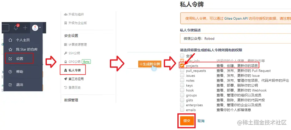 首先在Gitee上注册一个账号,然后新建一个仓库专门用来存放图片,然后去获取账号的Token:点击右上角头像,在弹出的下拉框中点击设置,然后在设置界面点击左侧的私人令牌,再点击右上角出现的生成新令牌按钮,把图中的projects勾上,其余的可以不勾。