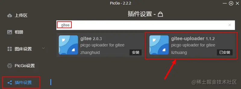 然后将PicGo下载下来安装好,默认PicGo是不支持Gitee图床的,所以先要下载Gitee的插件,不过下载插件之前电脑上必须安装node.js,否则插件安装不了,我一开始并不知道这一点,所以我插件一直安装不上,这也是我没有一开始就使用Gitee的原因之一。打开PicGo的界面,点击左侧的插件设置,然后搜索gitee,安装图中圈出的插件,等待插件安装完毕。