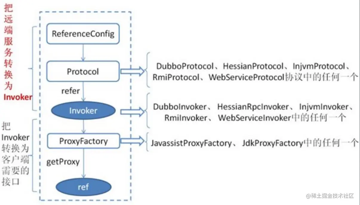 - ProxyFactory:Invoker 创建完毕后,接下来要做的事情是为服务接口生成代理对象。有了代理对象,即可进行远程调用。代理对象生成的入口方法为的getProxy。获取需要创建的接口列表,组合成数组。而后将该接口数组传入 Proxy 的 getProxy 方法获取 Proxy 子类,然后创建 InvokerInvocationHandler 对象,并将该对象传给 newInstance 生成 Proxy 实例。InvokerInvocationHandler 实现 JDK 的 InvocationHandler 接口,具体的用途是拦截接口类调用。可以理解为AOP或拦截器。也就是在获取该对象之前会调用到Proxy实例而不会调用到服务提供者对应的类。至于如何创建proxy实例,请看后面源码的注释。