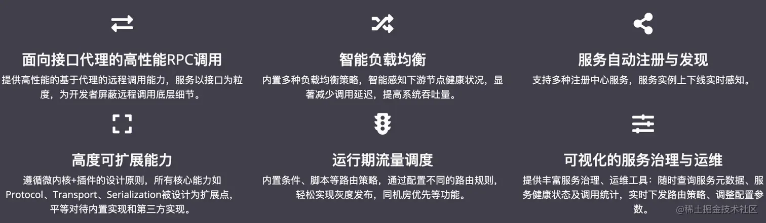 面向接口代理的高性能RPC调用,智能容错和负载均衡,服务自动注册和发现,高度可 扩展能力,运行期流量调度,可视化的服务治理与运维。