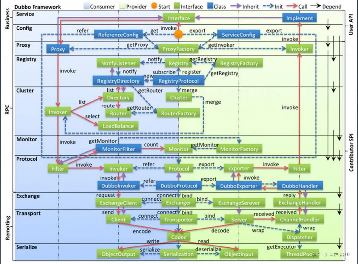 - protocol 远程调用层:封装 RPC 调用,以 Invocation, Result 为中心,扩展接口为 Protocol, Invoker, Exporter