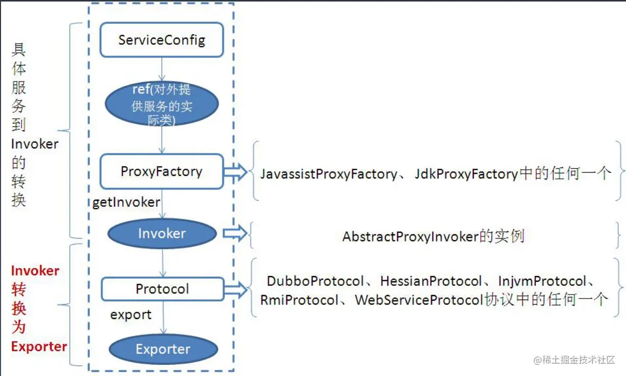 首先ServiceConfig类拿到对外提供服务的实际类ref,然后将ProxyFactory类的getInvoker方法使用ref生成一个AbstractProxyInvoker实例,到这一步就完成具体服务到invoker的转化。接下来就是Invoker转换到Exporter的过程。