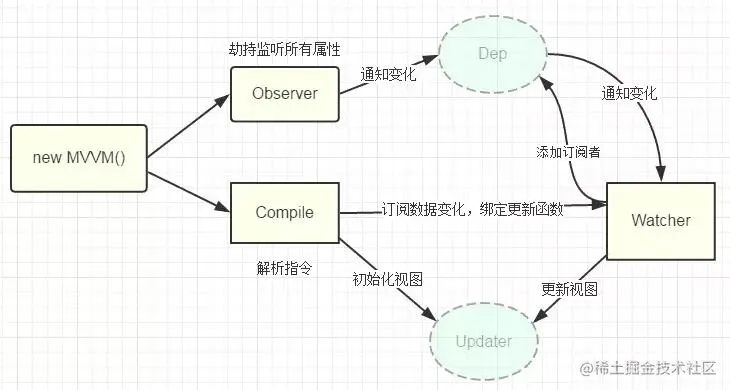 4、这样vue类作为数据绑定的入口,整合Observer和Compiler、Dep、Watcher;通过Observer来监听model数据的变化,通过Compile来解析编译模版指令,最终通过Watcher建立起Observer和Compiler的连接,就实现了数据更新->视图更新;视图交互变化->数据model变更的双向数据绑定效果