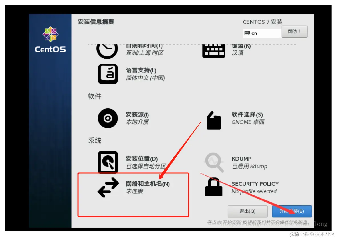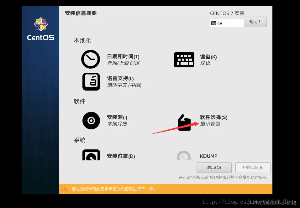 1、大家注意此处软件选择默认的是最小安装,如果大家不注意,就会只安装命令行模式的系统,到时候你就悲剧了,各种问题各种崩溃!